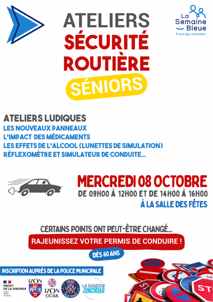 Dans le cadre de la « Semaine Bleue » qui se déroule du 04 au 11 octobre, en partenariat avec le CCAS de la commune, la préfecture de la Gironde et l’association « La Sagesse Active », une journée de sensibilisation à la sécurité routière à destination des séniors (+ 60 ans) est organisée.